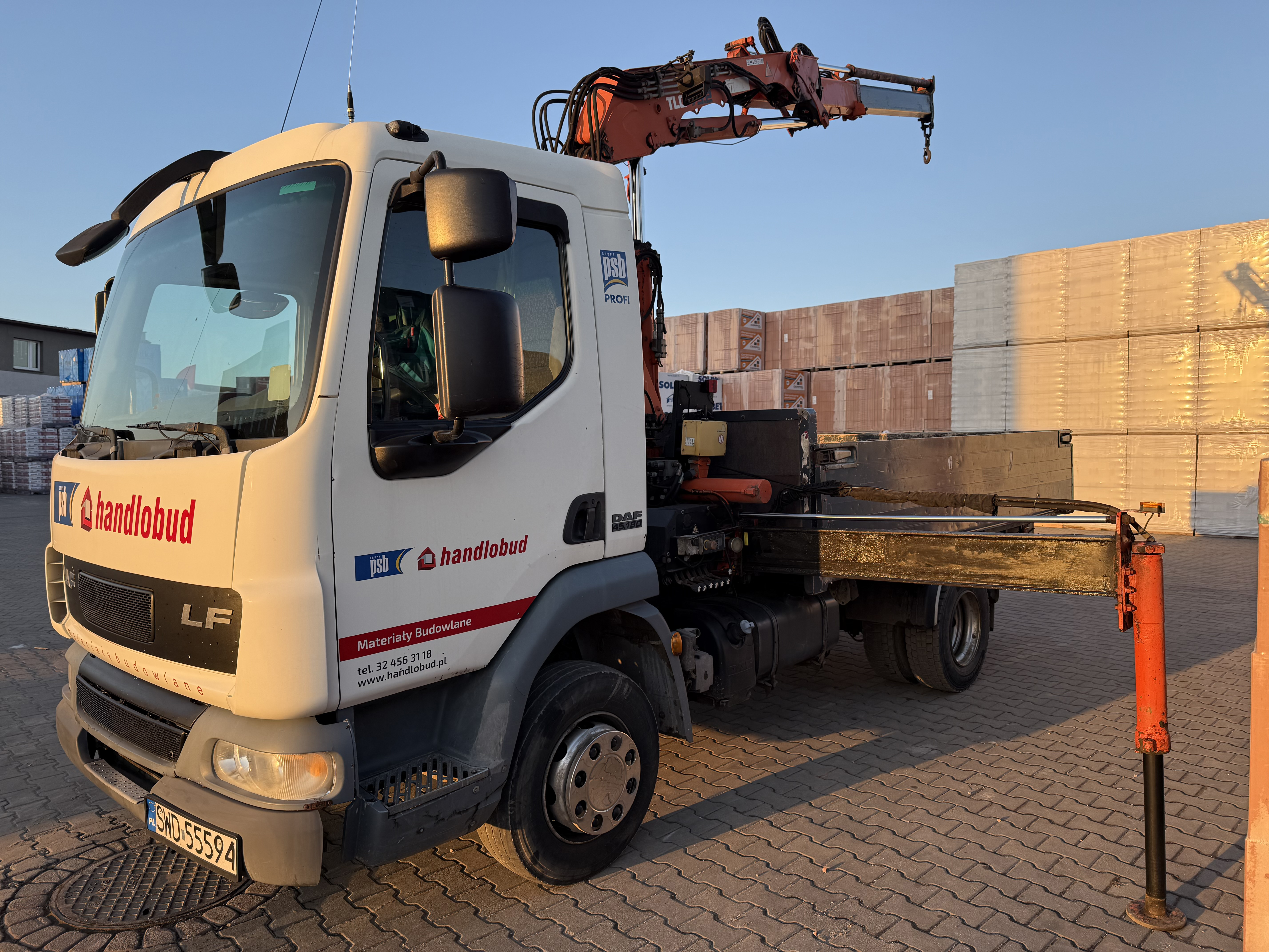 DAF CF 85.410 (6×2) ze skrzynią ładunkową (burty) o wymiarach ok. 6,2 × 2,5 × 1,0 m, wyposażony w żuraw HIAB 166K-2PRO (rok budowy 2007, udźwig do 4,1 t ). Kabina dzienna, klimatyzacja, zawieszenie pneumatyczne z tyłu. Pojazd z naszej floty – pewne pochodzenie.