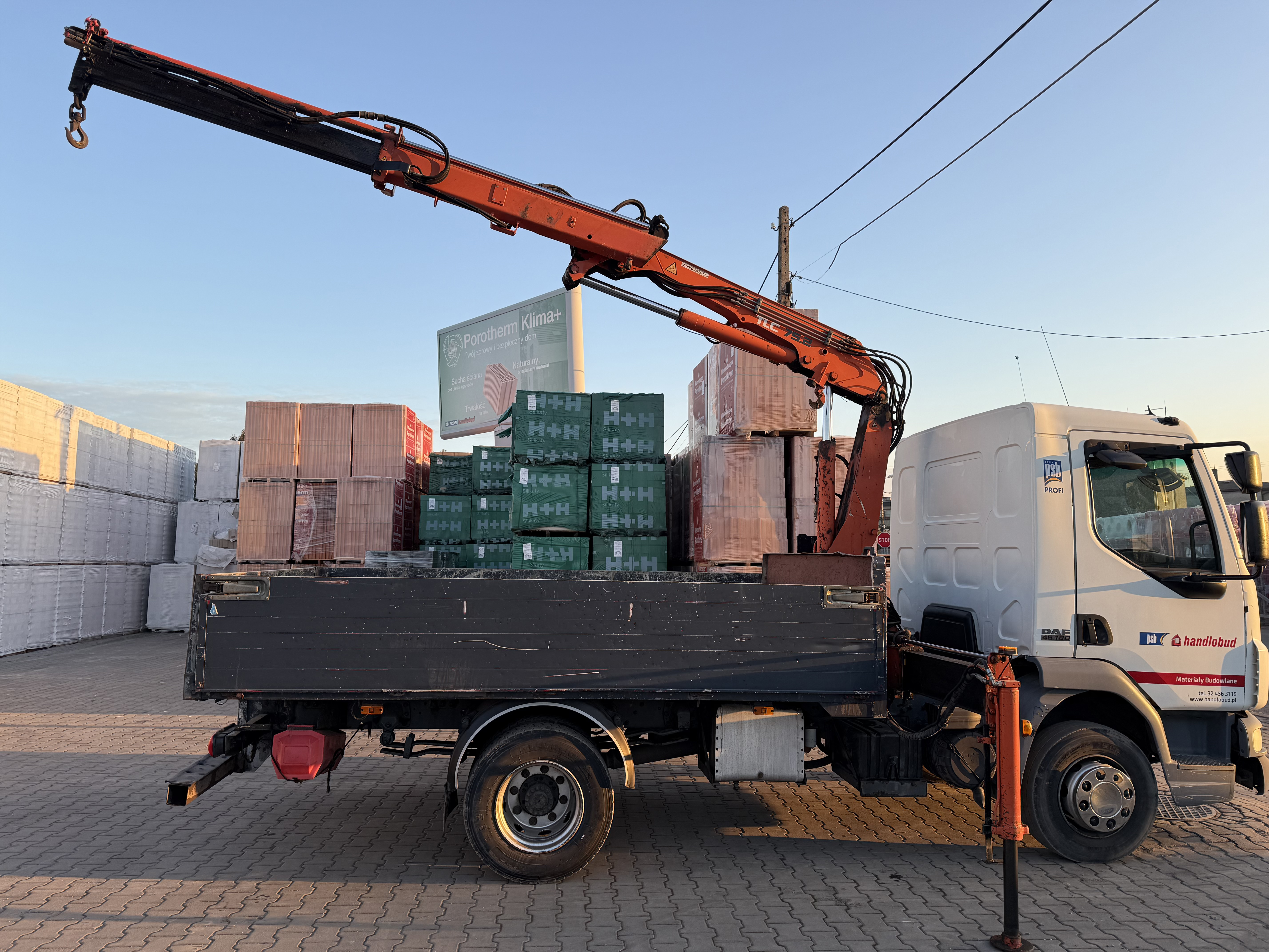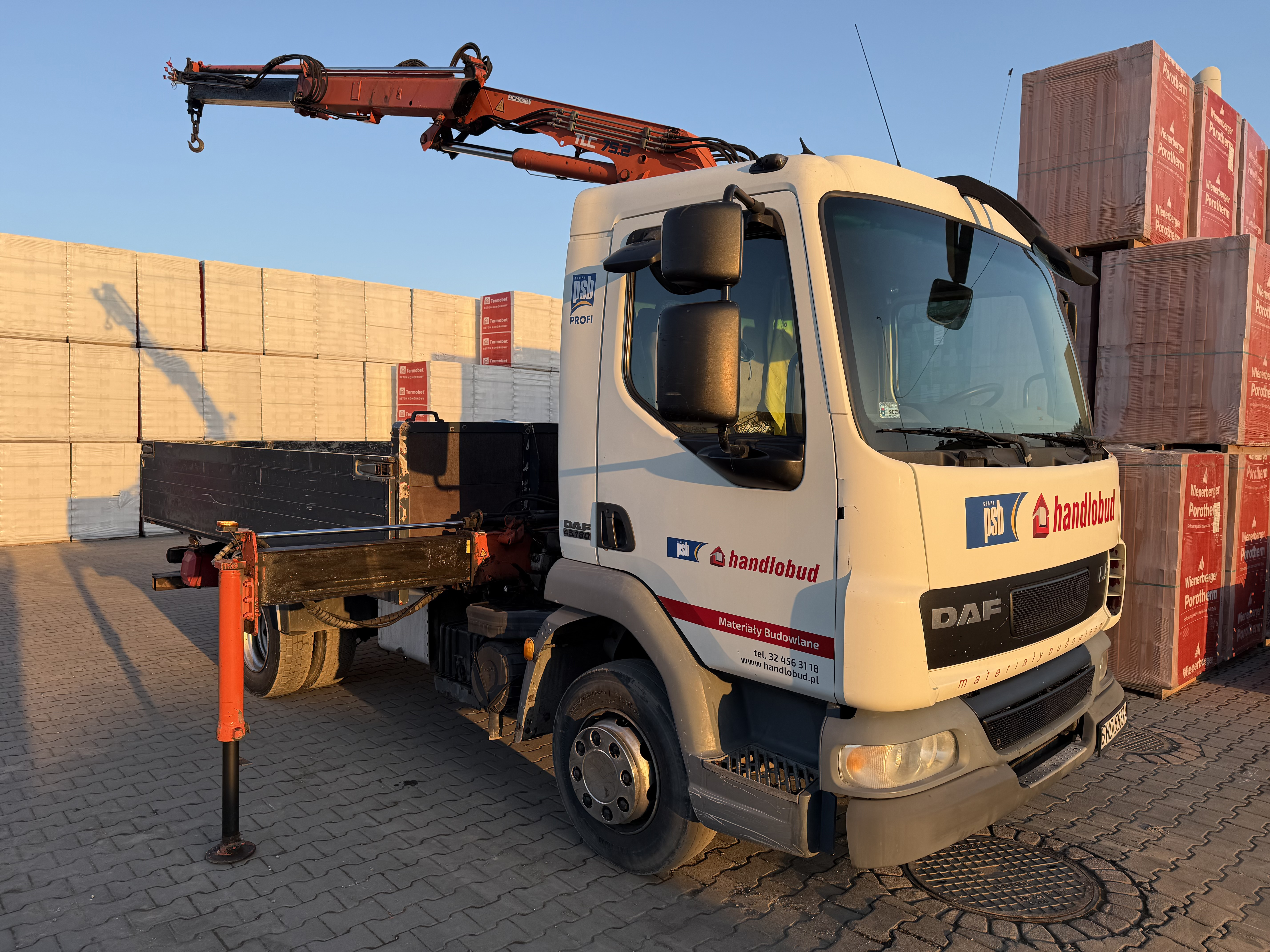 DAF CF 85.410 (6×2) ze skrzynią ładunkową (burty) o wymiarach ok. 6,2 × 2,5 × 1,0 m, wyposażony w żuraw HIAB 166K-2PRO (rok budowy 2007, udźwig do 4,1 t ). Kabina dzienna, klimatyzacja, zawieszenie pneumatyczne z tyłu. Pojazd z naszej floty – pewne pochodzenie.
